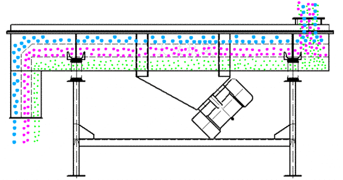 直線篩是一種大產量的篩分設備,采用振動電機作為激振源,使煙葉在篩網上被拋起,同時向前做直線運動,煙葉在給料機上均勻地進入篩分機的進料口,通過多層的篩網產生數種規格的篩上物和篩下物,分別從各自的出口排出,完成篩分作業。