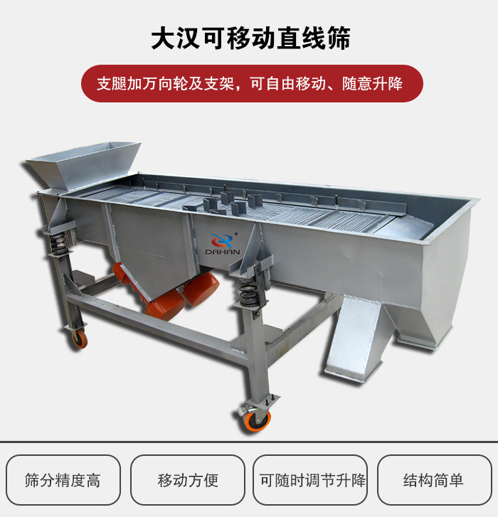可移動直線篩又叫做可移動式直線振動篩,支腿加萬向輪及支架,可自由移動可隨意升降,方便客戶根據(jù)現(xiàn)場需要隨時調(diào)節(jié)。進料口加裝分料器,緩沖物料對篩面的沖擊,物料均勻的投入篩面,可提高篩分效率。