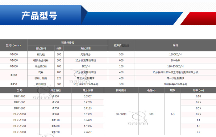 超聲波振動篩的常規(guī)型號有DHC-400、DHC-600、DHC-800、DHC-1000、DHC-1200、DHC-1500、DHC-1800、DHC-2000等,同時大漢機械支持產品特殊定做,根據(jù)您的要求為您定制出合適的設備!